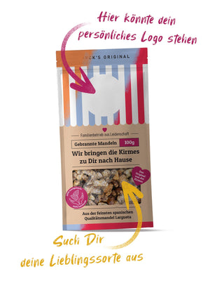 Nachdem Du uns die Grafikdatei Deines Logos sowie einen möglichen Wunschtext genannt hast erstellen wir ein individuelles Etikett. Die Mandeln werden frisch für Dich gebrannt, die Verpackungen gebrandet und direkt zu Dir in die Firma geschickt, sodass Du Deine Kunden, Mitarbeiter und Leiferanten persönlich beschenken kannst.